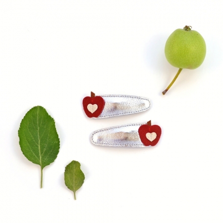 The perfect Fall accessory comes in your favorite Fall fruit! 6 cm silver leather snap clips come with stitched red apples, topped with a little heart and even smaller stem.