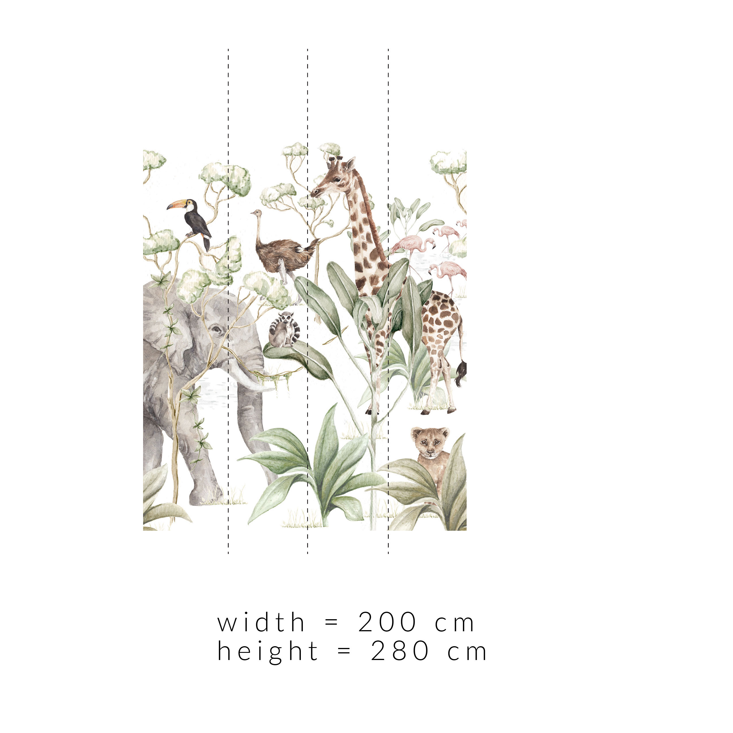 Measurements of some animals: an elephant reaches 155 cm, a giraffe height is 230 cm, and flamingos are set from a height of 140 to 190 cm. Little lion hides behind the leaves, which measure (together with him) 65 cm, and the trees in the background climb to a height of almost 240 cm.